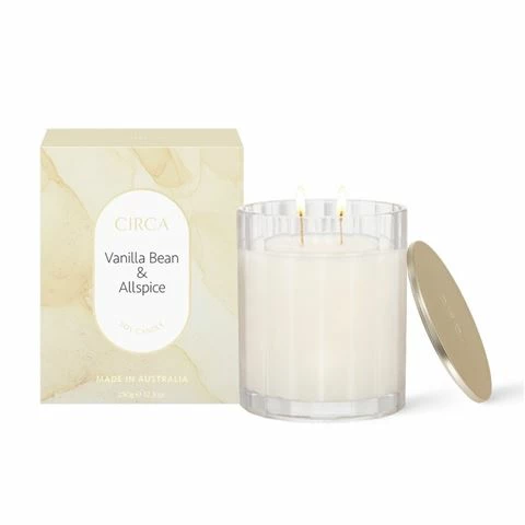 Elevate your senses with Circa Home’s Vanilla Bean & Allspice Soy Candle.. Warm, welcoming and deliciously calming, the blend of vanilla and allspice is guaranteed to soothe the senses. With sandalwood, patchouli and a citrusy hint of bergamot, this fragrance candle brings all the comfort of a hug to your home.