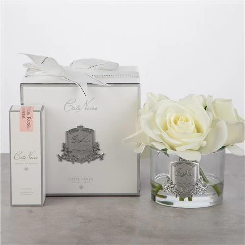 - Beautiful rose arrangements presented in a glass vase set with gel, and infused with fine fragrance.