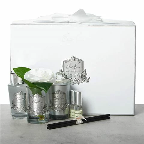 The set features a mini gardenia diffuser, mini gardenia candle and single white gardenia faux scented floral in a gel infused with a fine fragrance.