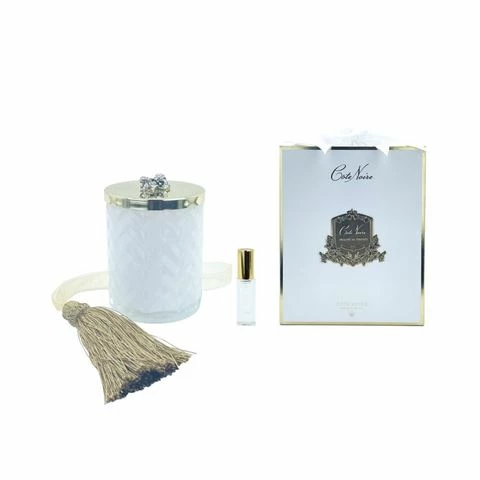 Discover this Limited Edition, White Herringbone Winter At The Chateau Scented Candle, which comes in a decorative herringbone glass canister with a bejewelled lid. Also included is a Golden Tassel with its own spray on scent, so you can build on this evocative fragrance. It is then arrayed in a white and gold beribboned gift box, making it one of the beautiful festive gifts.