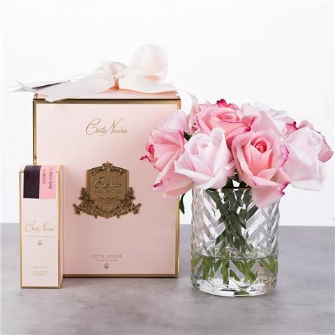 Enclosed with your natural touch Mixed Pink Rose Buds is two bottles of scent including Pink Peony and Rose Oud. Spray either one directly onto the roses to refresh & enhance their fragrance.Β This stunning life-like arrangement has been handcrafted, utilising a special natural coating that makes each petal pop. Itβs housed within a herringbone patterned glass jar and set with a clear gel.