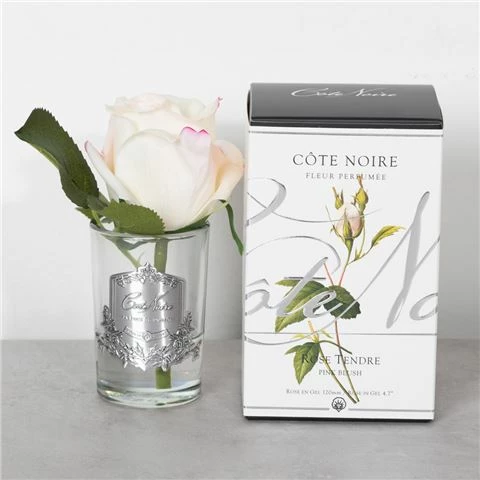This beautiful life-like Pink Blush Rose Bud design has been set in a gel infused with a fine fragrance. Presented with one Rose Petal scented spray perfume, you can spray directly onto your flower to refresh and enhance its scent. This stunning life-like rose has been handcrafted, utilising a special natural coating that makes each petal pop. Itβs housed within a clear glass jar embellished with a silver crest.