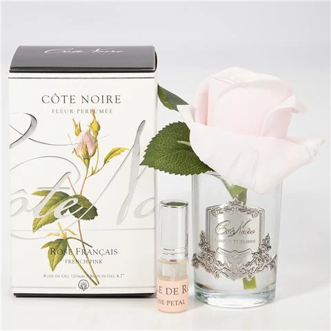 This beautiful life-like French Pink Rose Bud has been set in a gel infused with a fine fragrance. Presented with one Rose Petal scented spray perfume, you can spray directly onto your flower to refresh and enhance its scent. This stunning life-like rose bud has been handcrafted, utilising a special natural coating that makes each petal pop. Itβs housed within a clear glass jar embellished with a silver crest.