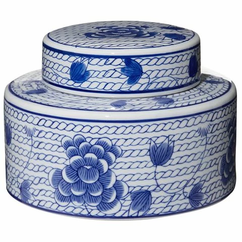 The Blue & White Chain Blossom Jar by Flair Décor is made from ceramic, and features an intricate floral and nautical rope design. With a blue and white colour finish, this jar is complete with a lid. This jar would make the perfect décor piece.