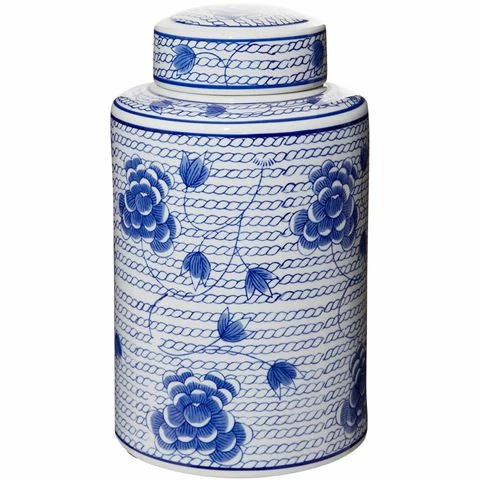 The Blue & White Chain Blossom Tall Jar by Flair Décor is made from ceramic, and features an intricate floral and nautical rope design. With a blue and white colour finish, this jar is complete with a lid. This jar would make the perfect décor piece.