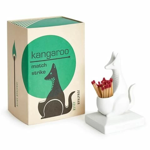 The Kangaroo Match Strike features a white porcelain bisque match holder and match strike. There’s a frictional surface on the base that ignites strike-anywhere matches. A bold design that’ll make a statement in your home.
