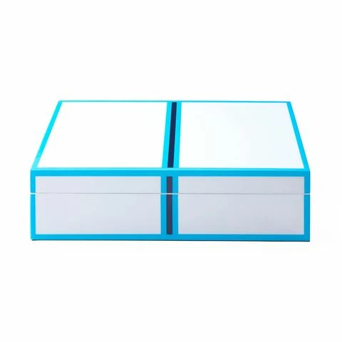 Jonathan Adler Small Zip Lacquer Box is a treat. Trimmed with bright neon lines, this classic ivory and navy stacking box is crafted from high gloss, hand-finished lacquer and it looks sensational when stacked with other boxes in the collection.