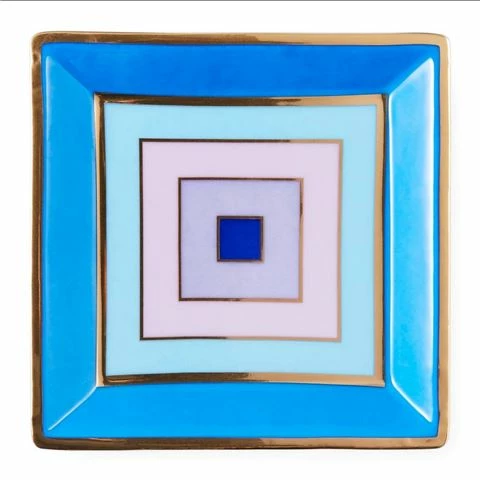 Jonathan Adlerโs Scala Square Tray features 1960sโ inspired geometric stripes in cool blues and shades of lavender. Crafted from high-fired porcelain with gleaming real gold accents, itโs a statement piece on any surface.