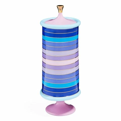 The Scala Large Canister is pastel perfection. It features 60s inspired geometric stripes in cool blues and shades of lavender, with a shiny gold accent. Style with other pieces from the Scala collection for a mesmerising moment.